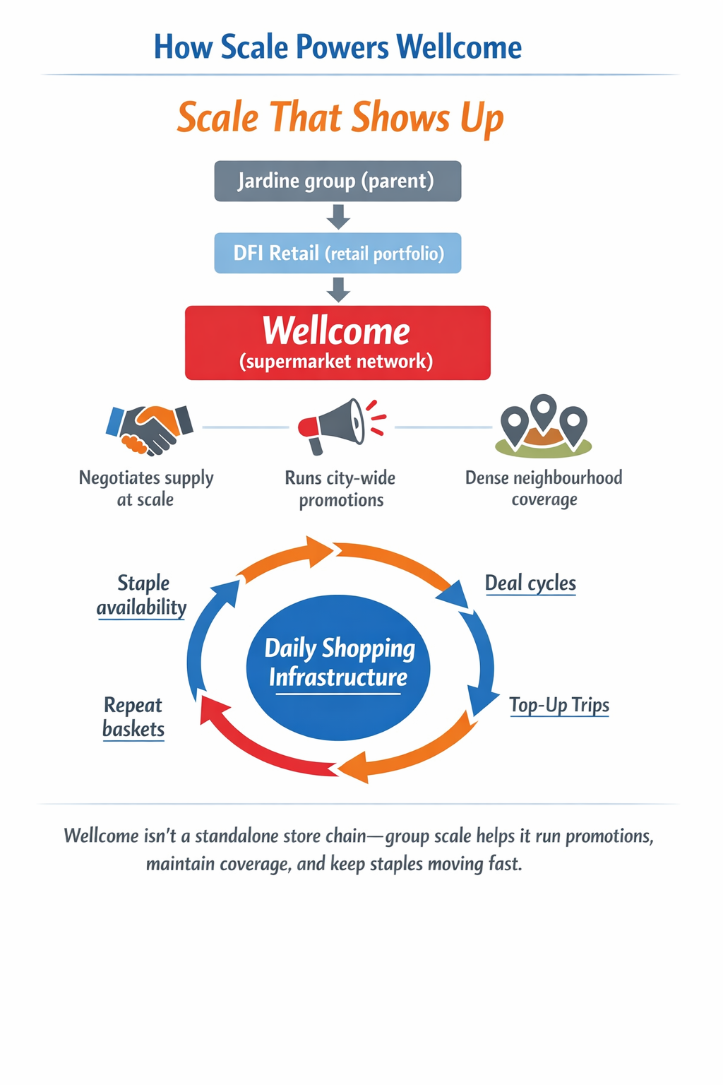 Wellcome is owned by DFI Retail Group, the grocery arm inside the wider Jardine Matheson group. In practical terms, that matters because Wellcome is not a standalone supermarket making isolated decisions. It sits inside a retail portfolio that also includes convenience and health-and-beauty brands, which means it can negotiate supply at scale, run city-wide promotions, and keep a dense store network that works like “daily shopping infrastructure” for many neighbourhoods.